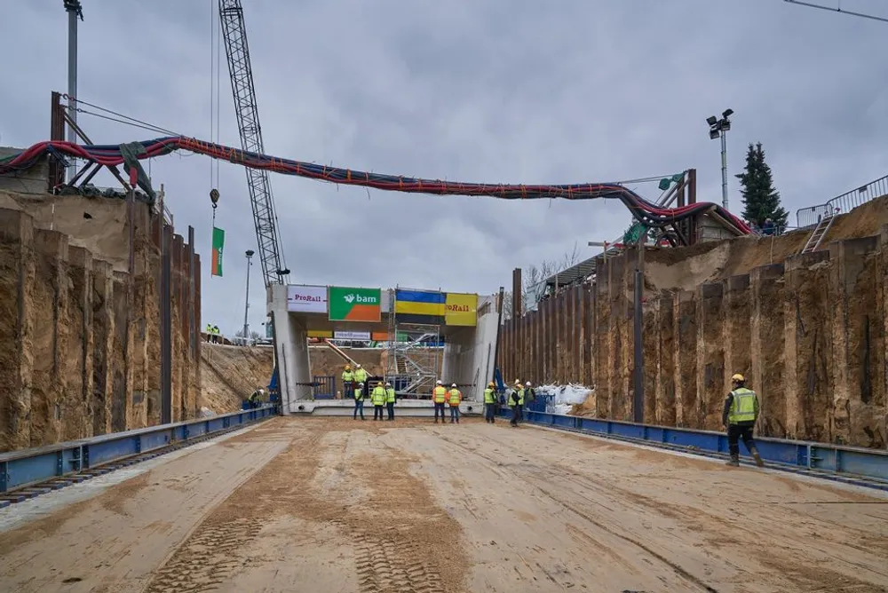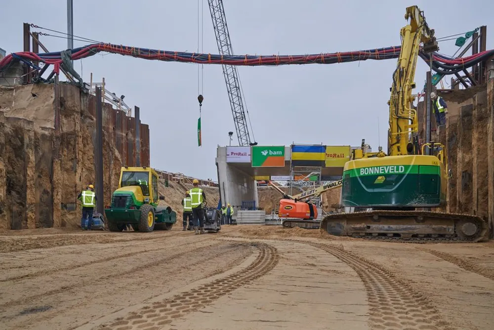 ruim 15.000 m3 grond ontgraven en afgevoerd dient te worden. Op deze voorbouwlocatie bouwt BAM Infra een tunnelmoot van maar liefst 1.200 ton die uiteindelijk onder het spoor komt te liggen. In de eerste treinvrije periode (TVP) zullen er haaks op het spoor twee rijen damwandplanken aangebracht worden,